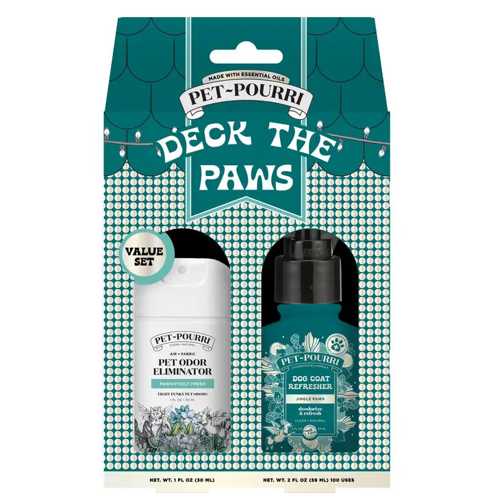 1oz Pocket Pawsitively Fresh: pineapple + jasmine + pear • 2oz Jingle Paws Dog Coat Refresher Spray (New Scent): caramel + coconut + vanilla The ultimate holiday gift for pet lovers who take their pets (and their smell) seriously. Give pet funk the sleigh ride over the hills, through the woods, and out of your home! This limited-edition gift set includes the fan-favorite Pawsitively Fresh Air & Fabric Spray + the NEW holiday coat refresher, Jingle Paws. • The Perfect Ho-Ho-Holiday Gift: Give pet parents the gift of a fresher home and funk-free fur with this limited-edition duo formulated to remove odors and spread holiday cheer, not holiday funk. • Instant Freshness, No Lingering Odors: Eliminate strong pet odors fast with this 2-in-1 gift set of our best air and coat sprays. Perfect odor eliminator for dog, cat, litter box, carpet, or car funk. • Naturally Derived & Pet-Safe: Includes Pawsitively Fresh spray + limited-time Jingle Paws refresher. 2 pet-safe, plant-based odor removers that tackle litter, urine, and musty fur odors entirely. • Multi-Purpose Whole Home Care: Safe for use in the air, on carpets, and fabrics, making it the perfect solution for freshening up pet beds, carpet, couches, rugs, car seats, and more. A must-have for pet owners looking for a clean, pet odor-free home.