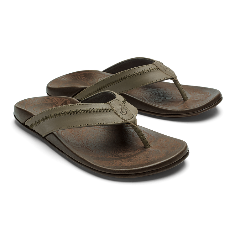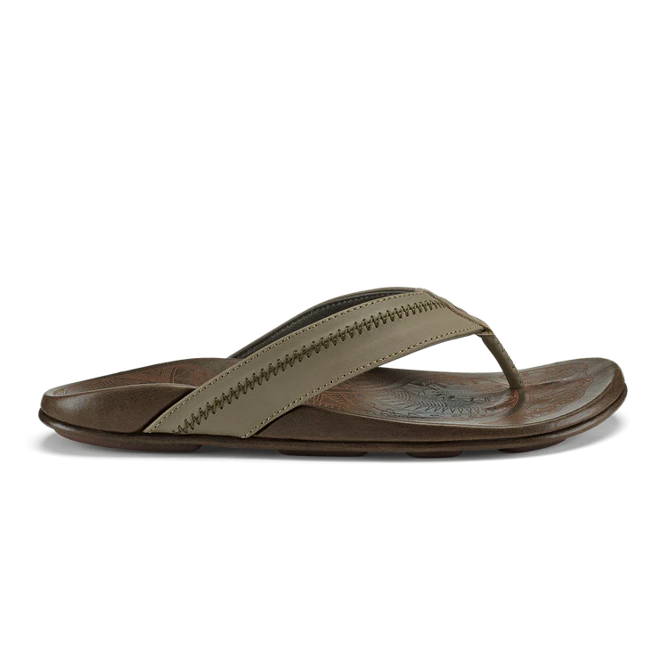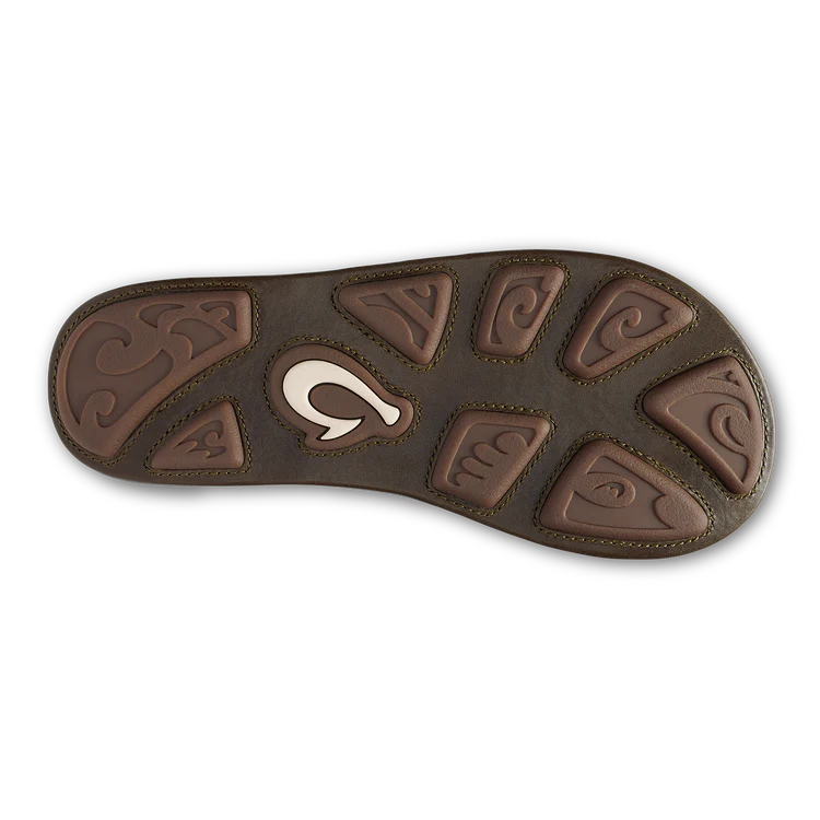 OluKai Craftsmanship: Features handsewn traditional whipstitching and moko tattoo artwork on the footbed, showcasing unique cultural artistry.